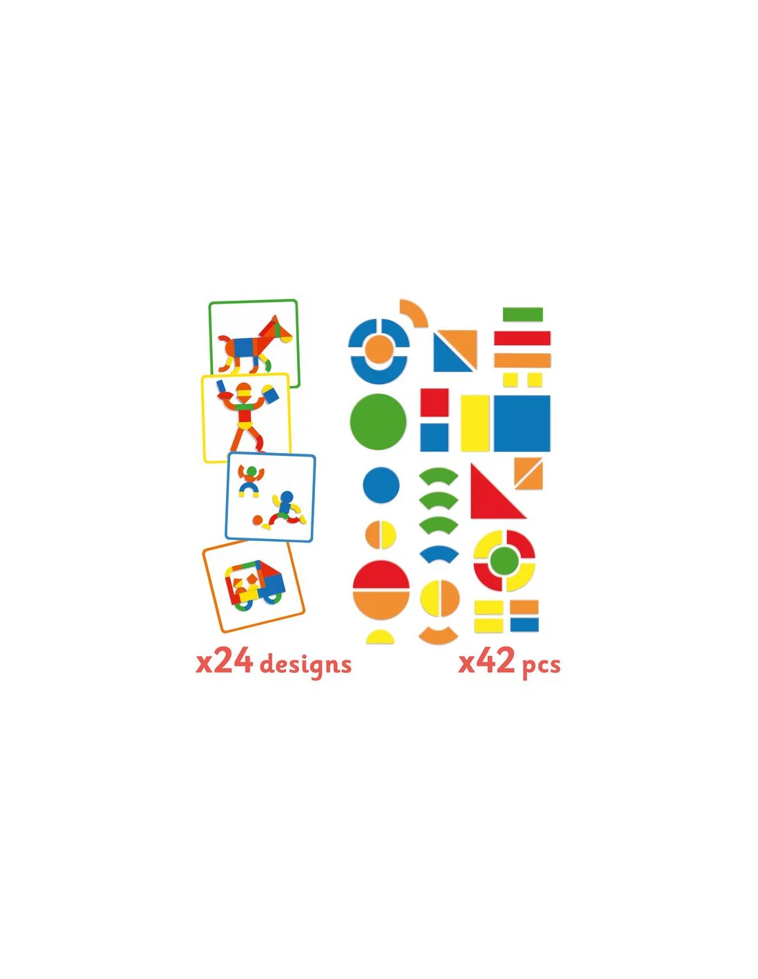 | Format : | Une mallette en bois, 24 modèles (6 modèles verts, 6 modèles rouge, 6 modèles bleu, 6 modèles orange), 42 pièces magnétique en bois. / 30x30cm |