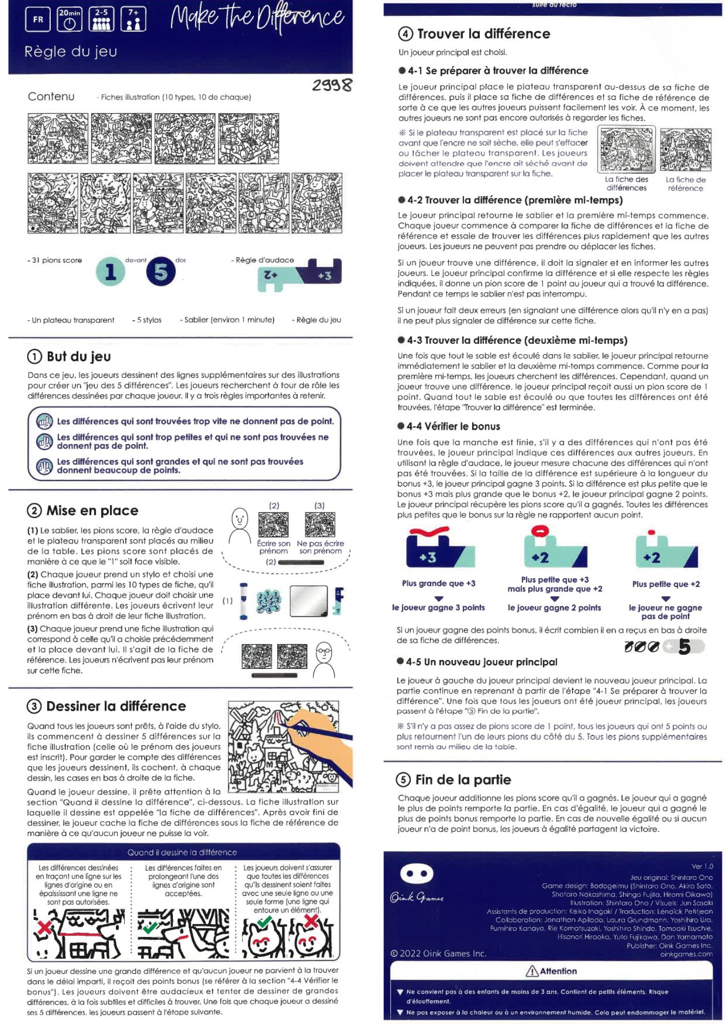 | Résumé : | Make the Difference mélange Où est Charlie et le jeu des sept différences, pour un jeu d'ambiance fun et accessible. Avec ses règles qui récompensent l'audace et le stress du temps limité, il crée des ambiances où les éclats de rires ponctuent les silences concentrés ! Un très bon jeu à sortir en famille comme entre amis ! |