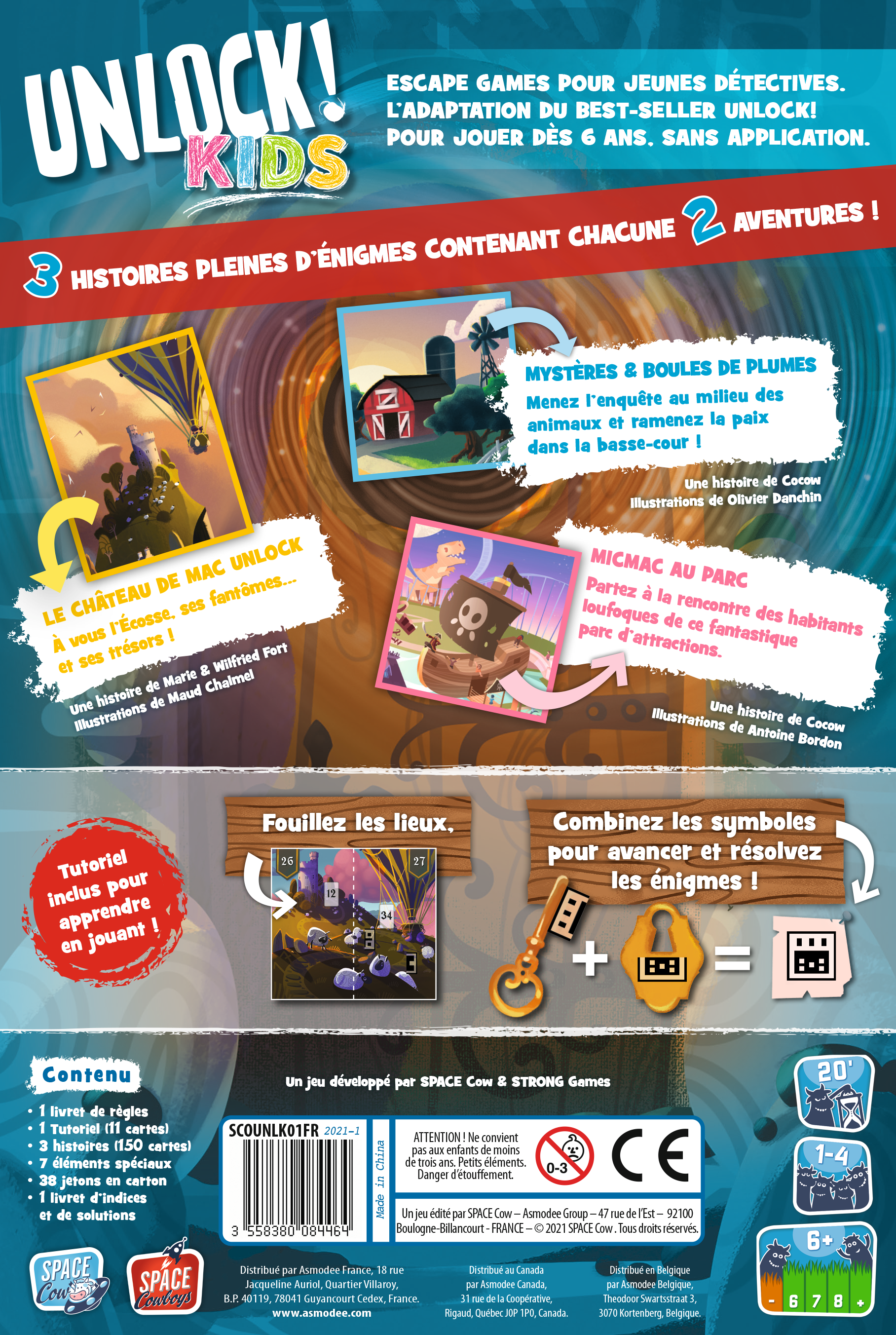Jouable dès 6 ans avec des règles adaptées spécialement pour les enfants: - Des énigmes adaptées aux enfants, sans utiliser d'écrans ! - Les solutions complètes incluses dans la boîte - Tutoriel inclus: pas besoin de lire la règle - Des scénarios joués et validés par des enfants Découvrez dans cette boite 3 histoires pleines d'énigmes contenant chacune 2 aventures pour encore plus de rejouabilité ! - Mystères et boules de plumes: Menez l'enquête au milieu des animaux et ramenez la paix dans la basse-cour ! - Le château de Mac Unlock: Découvrez les légendes de l'Ecosse. A vous l'exploration du château, ses fantômes et son trésor... - MicMac au parc: Partez à la rencontre des habitants loufoques de ce fantastique parc d'attractions. |